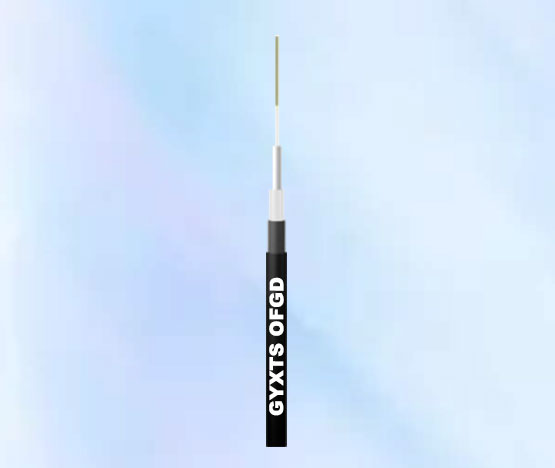 GYXTS 光纜結構是將單模光纖或多模光纖由高模量的聚脂材料作成的松套管中,套管內填充防水化合物。松套管外加阻水材料以保證光纜的縱向滲水,鋼絲繞包成纜后雙面鍍鉻涂塑鋼帶(PSP)縱包,再在外擠制聚乙烯護套。